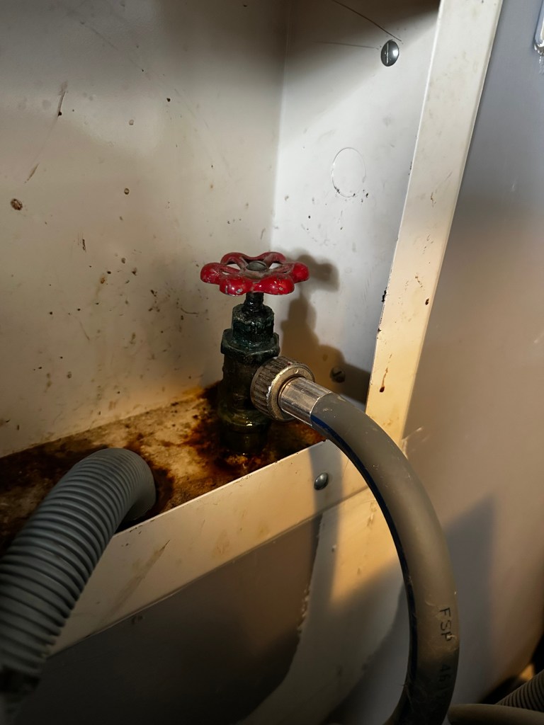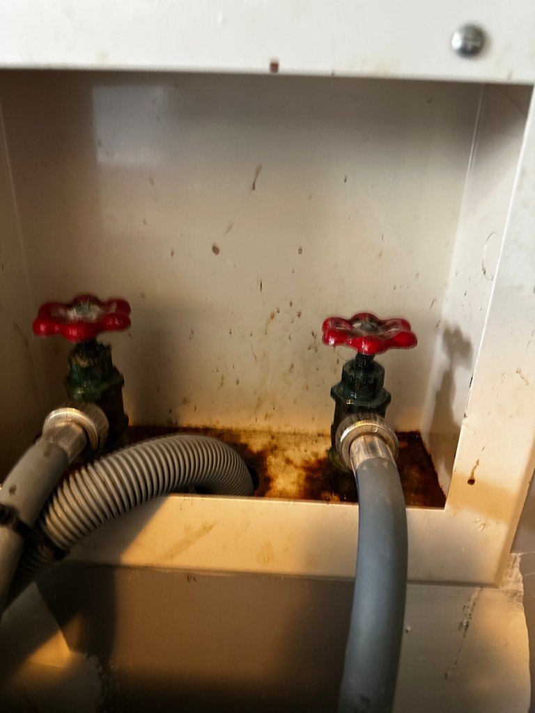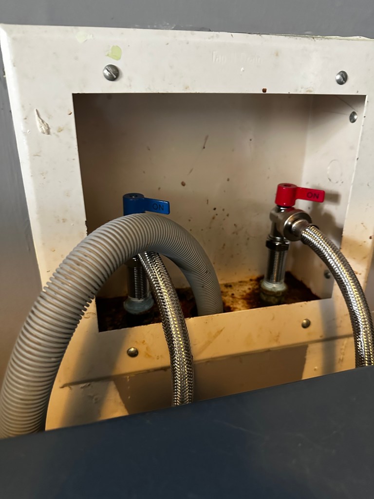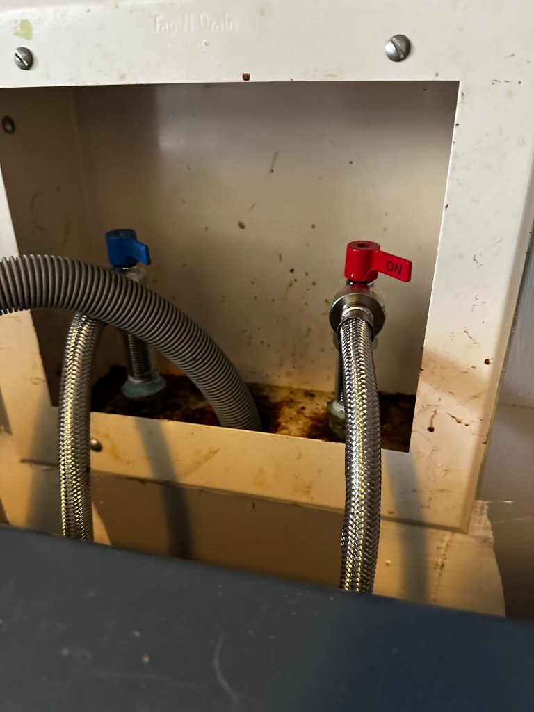 The client called because their washing machine was throwing an error code indicating inadequate water supply. On inspection, the old rubber supply hoses were more than half clogged with mineral buildup, and the existing valves no longer functioned to shutoff the water supply. Replaced with new 1/4 turn ball valves to simplify water shutoff for emergencies and repairs, and new braided steel supply lines.